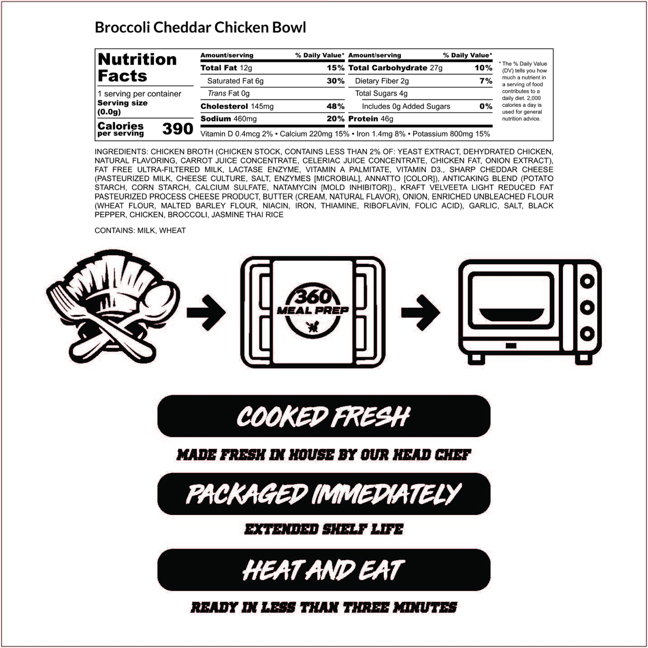 Our Broccoli Cheddar Chicken Bowl is a high-protein, chef-crafted meal designed to keep you full, satisfied, and on track—without sacrificing flavor. Tender, seasoned chicken breast is paired with fluffy jasmine rice and fresh broccoli, then finished with a rich, creamy cheddar sauce that delivers classic comfort without the guilt.